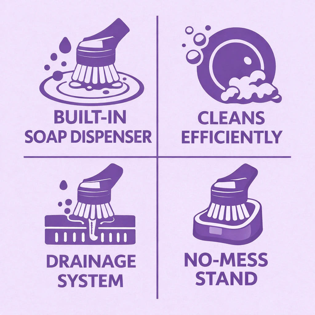 • BUILT-IN SOAP DISPENSER – Fill once, then press to release soap exactly when you need it—less mess, less waste.