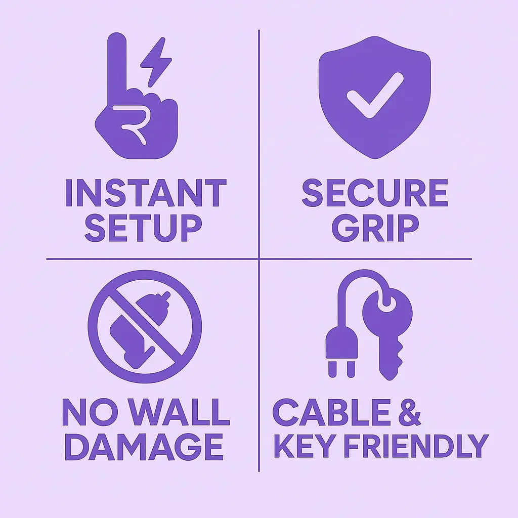 - MULTI-SURFACE, NO-DRILL – Adhesive base installs in seconds—desks, nightstands, dashboards.